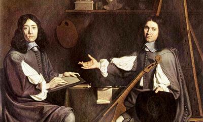 Beide artiesten, geboren in 1631, hadden precies in 1654 -datum voorkomende op de tekening die men in het midden van de tafel ontwaart - de leeftijd van 23 jaar bereikt. Zij waren studiegenoten die allebei in de leer waren bij de grote kunstschilder Philippe de Champaigne. Als portretschilder had deze zich bekendheid weten te verzekeren en beide wensten zich op dit genre toe te leggen.