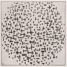 In vergelijking met zowel Van Doesburg als Van der Leck mag, dacht ik, gesteld worden dat Mondriaan het eerste van hen de daad bij het woord voegde en schilderijen maakte die geheel uit niet naar natuur verwijzende elementen waren opgebouwd. Het kan zijn dat Van der Leck iets eerder was met het benoemen van een schilderij als 'geometrische compositie' terwijl de daarop voorkomende elementen, hun kleur en rangschikking op het vlak, bijna letterlijk van een eerder schilderij uit hetzelfde jaar (1917) zijn overgenomen. Dit schilderij is een geschematiseerde weergave, in horizontale en vertikale lijnstukken opgelost, van een onderwerp met de titel 'Het uitgaan van de fabriek' (beide schilderijen zijn in het bezit van het Museum Kröller-Müller) waarin het onderwerp nog duidelijk is terug te vinden.