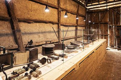 In het oorspronkelijke bakhuis op het erf uit Meeuwen, waar de oven nog voor educatieve doeleinden wordt aangestoken, is het gereedschap te zien waarmee in de negentiende eeuw thuis werd gebakken. Wie